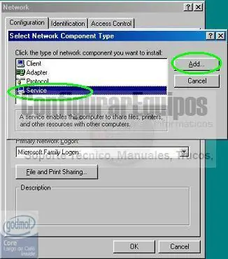 Esta ventana nos solicita el tipo de componente de red que queremos instalar seleccionamos “Servicio” (Service) y pulsamos en el botón “Añadir” (Add) y nos aparece la siguiente ventana:
