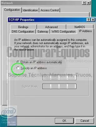 Por defecto, aparecerá siempre marcada la opción “Obtener una dirección IP automáticamente”, cambiaremos la selección a “Especificar Una dirección IP” (Specify an IP address), con lo que cambia la ventana y podemos introducir los valores: