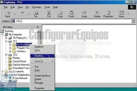 Ahora vamos a compartir una carpeta en el PC2, concretamente la carpeta Mis Documentos, para ello, pulsamos con el botón derecho del ratón sobre dicha carpeta en la ventana del explorador de Windows como podemos ver en la imagen