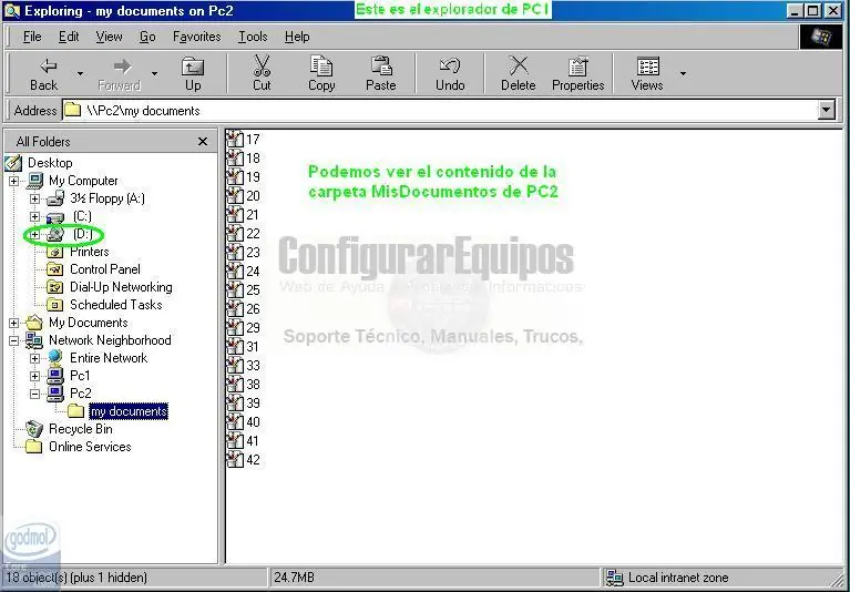 Comprobamos que desde el explorador abierto en el PC2, estamos accediendo al disco duro compartido en el PC1. Y para comprobar que realmente hay acceso, copiamos las imágenes guardadas en la carpeta Mis Documentos de PC1 a la carpeta Mis Documentos de PC2