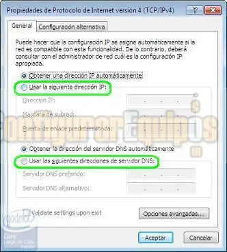 Aparece una nueva ventana y pulsamos sobre la opción Usar la siguiente dirección IP.