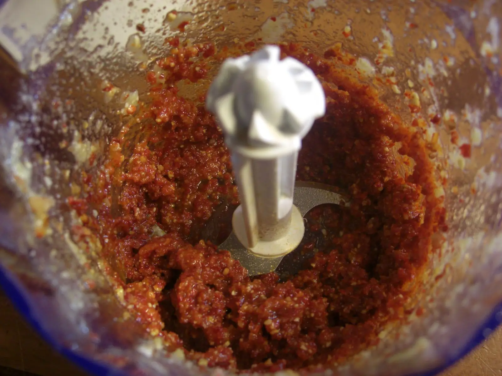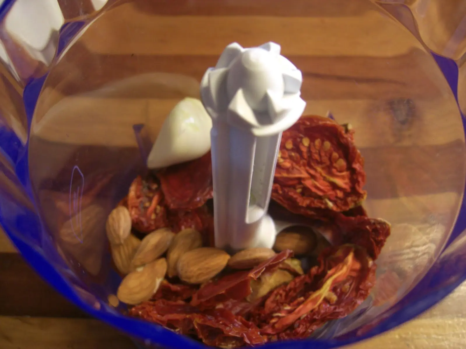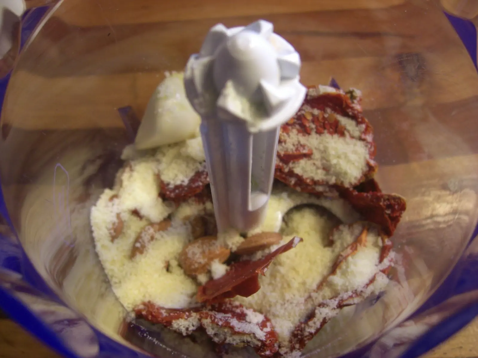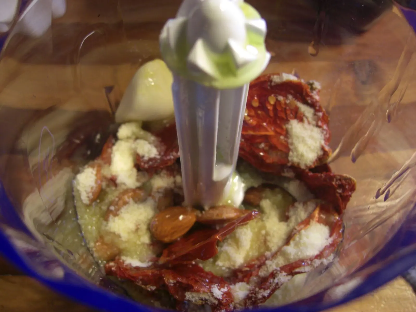 1) Primero preparamos el pesto de tomates: Ponemos en la procesadora los tomates deshidratados, las almendras, el queso rallado, el diente de ajo, la albahaca y por ultimo el aceite de oliva poco a poco. Procesamos de a poco hasta que nos quede una preparacion igual a un pesto clasico (granuloso, con consistencia aceitosa). Reservamos aparte.