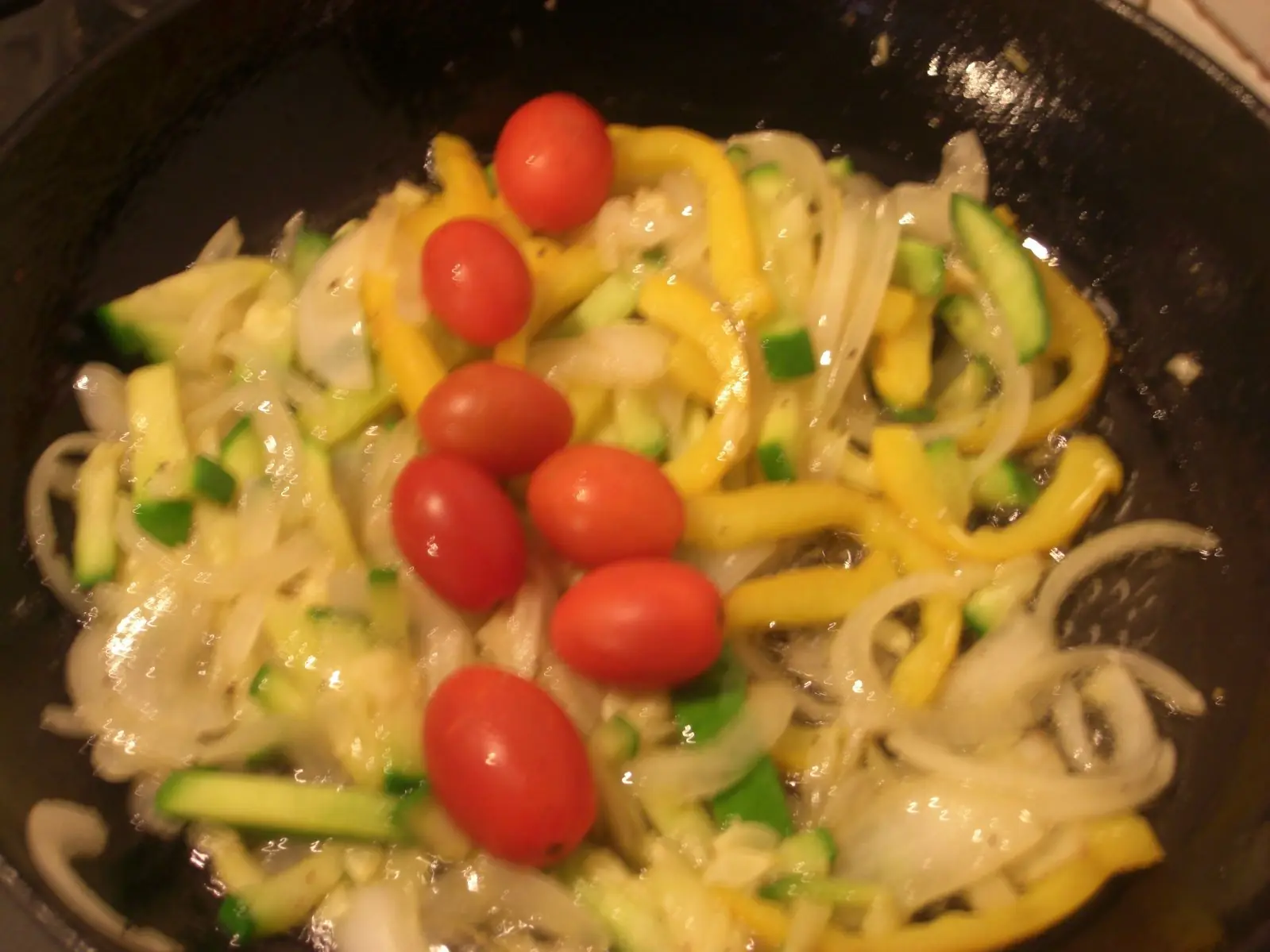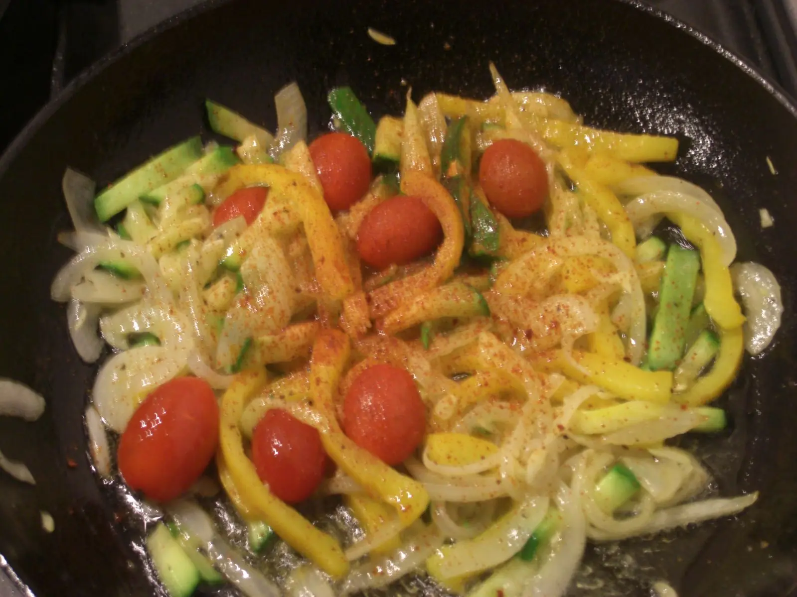 4) Mientras se cocina el bife, preparamos una sarten con aceite y manteca, y esperamos a q se caliente. Cuando este caliente junto a las grasas usadas, cocinamos la cebolla hasta que este transparente pasando a dorado. En ese momento colocamos el resto de las verduras y salpimentamos hasta que dore y cambie totalmente la textura de las verduras. Por ultimo condimentamos con el pimenton dulce.