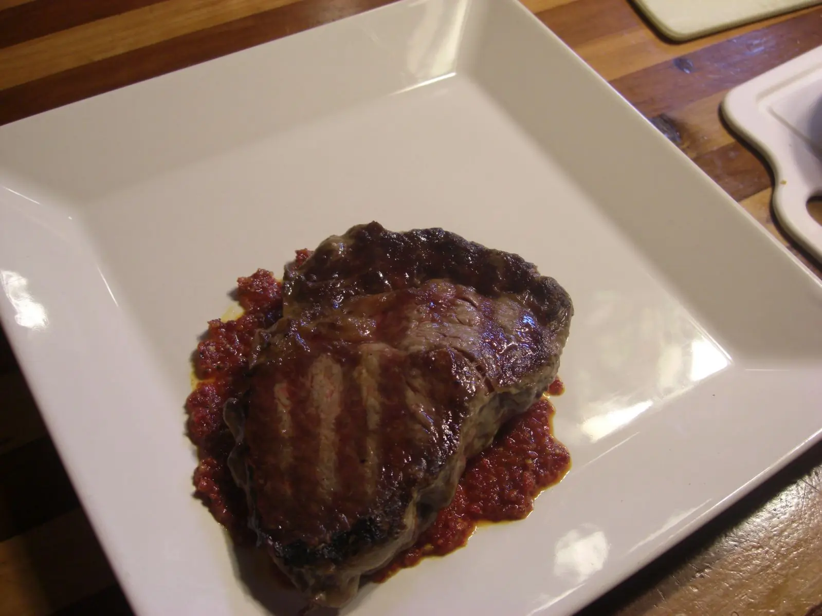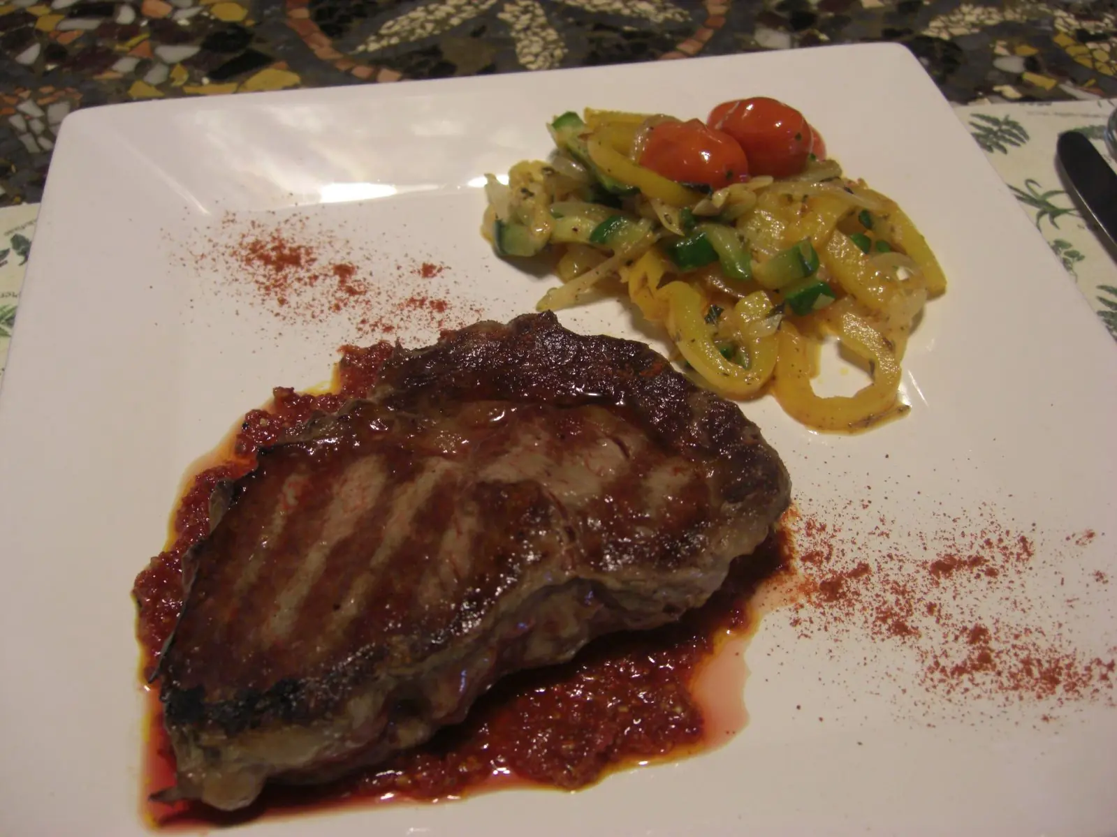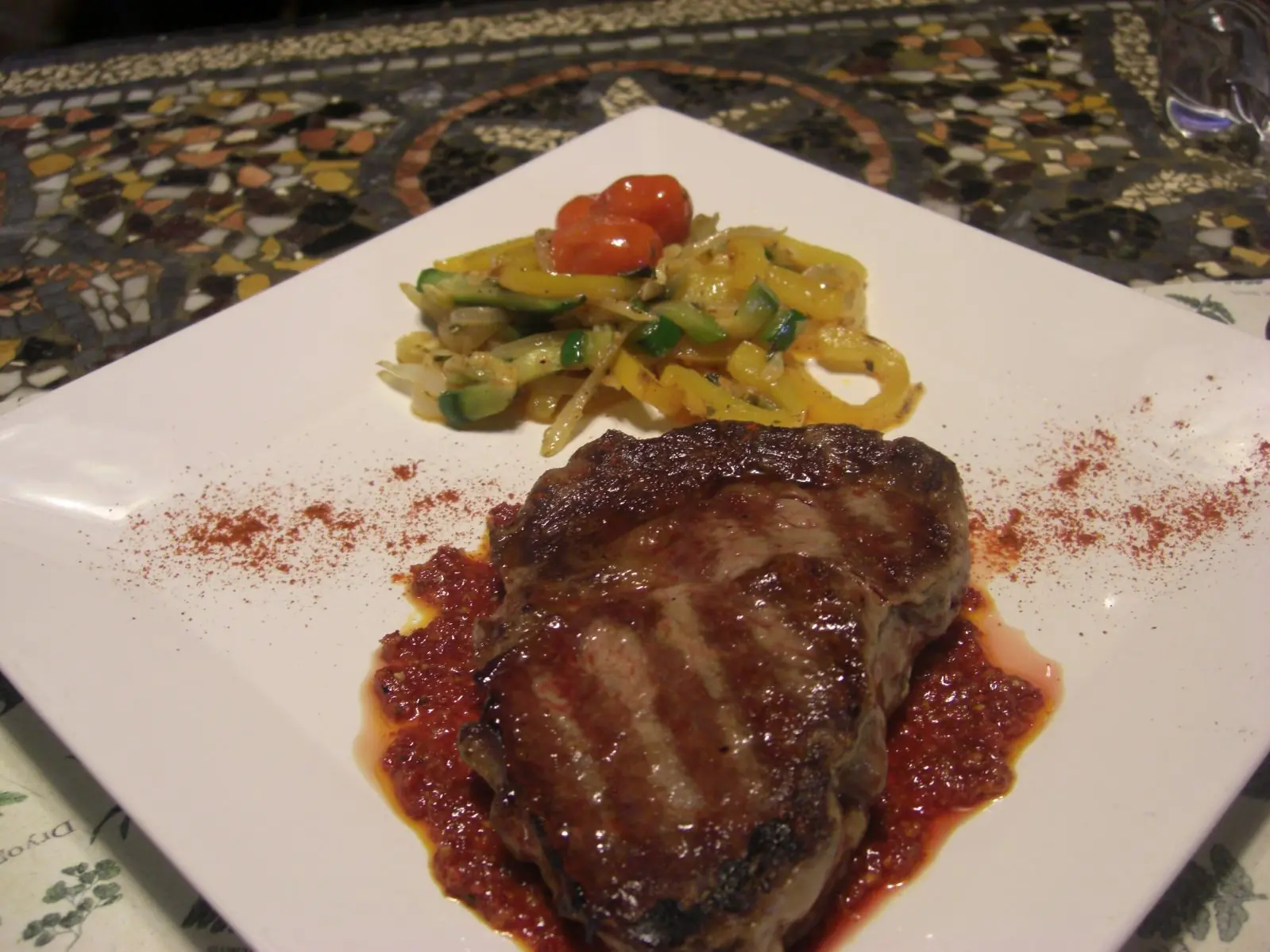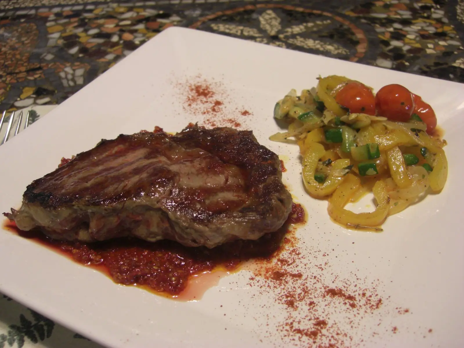 Plato del Dia: Bife Ancho sobre Pesto de Tomates Deshidratados con Salteado de Verduras