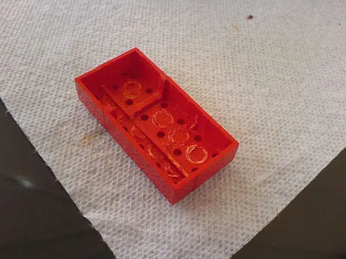 Debido a que mi memoria era bastante grande (en dimensiones, no en la capacidad de almacenamiento) cree un bloque Lego de 6x3. Corté un 4x2 y 2x2 con un ladrillo a la mitad con un cuchillo y el otro ladrillo como guía, las pinzas de la navaja mismas fueron utilizadas para eliminar los bits interior de los ladrillos y el cuchillo se utilizó una vez más para eliminar los lados . Otro 4x2 y 2x2 con un ladrillo se utilizaron para crear el caso.
