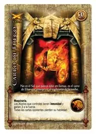 Y dandome cuenta, se puede contrarestar muy facil con cartas con INMUNIDAD, ORBE, y QUE NO PUEDAN PERDER SU HABILIDAD. Estas cartas pueden seguir jugándose, y seria verdaderamente patético que pongas el CARRO DE FUEGO, y tu oponente luego ponga a "JEREMIAS" de profesias, que hace ganar el control de una carta oponente pagando 2 oros. Te ganan el control y ahi quedo la fabulosa estrategia.