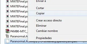 5.- Nos ubicamos en la carpeta donde copiamos el archivo del punto anterior, buscamos el archivo copiado y le damos a renombrar. En este punto debemos eliminar del nombre la ultima parte del archivo (.part) de esta manera el archivo quedará con la extension .avi (en este caso porq la peli es en formato avi)