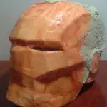 La placa frontal está conectado a un mecanismo deslizante giratorio, que empuja la placa frontal y la levanta haciendo girar el “botón” de la oreja izquierda. A continuación, seis LEDs azules de 3 mm y algunas resistencias se conectan a una batería de 9V y un interruptor para encender los ojos cubiertos con unas lentes de color azul de unas viejas gafas de sol.