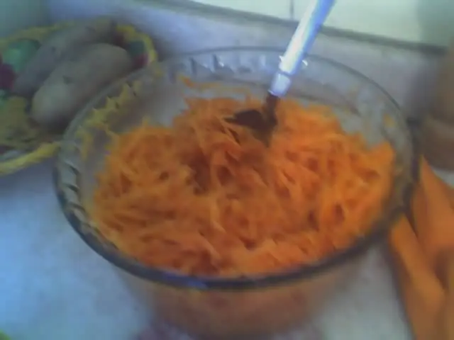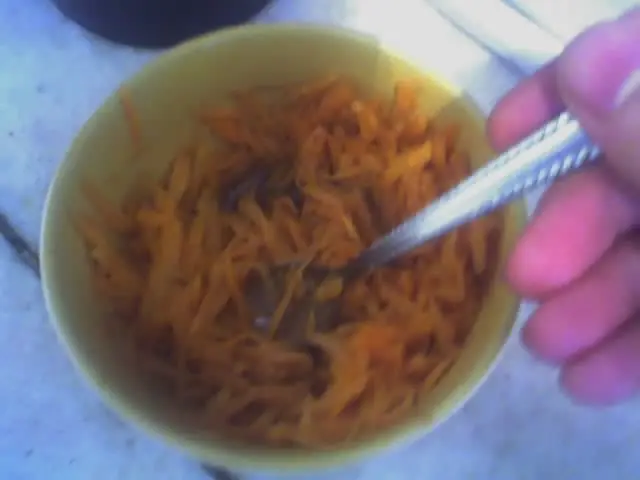 Ensalada de zanahorias ralladas, condimentada con una vinagreta de salsa de soja, vinagre de vino aceite de oliva y sal.