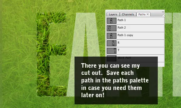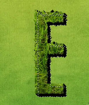 De todos modos, haga doble clic en el camino para llegar a la selección y volver a la capa de hierba. Duplicar la capa de hierba por lo que aún tiene más pasto para las otras letras, y luego invertir la selección (Ctrl + Shift + I) y cortar la hierba en exceso. En la captura de pantalla que se te haya marchitado de nuevo el duplicado de la capa de hierba para que pueda ver el corte "E" parte.