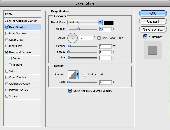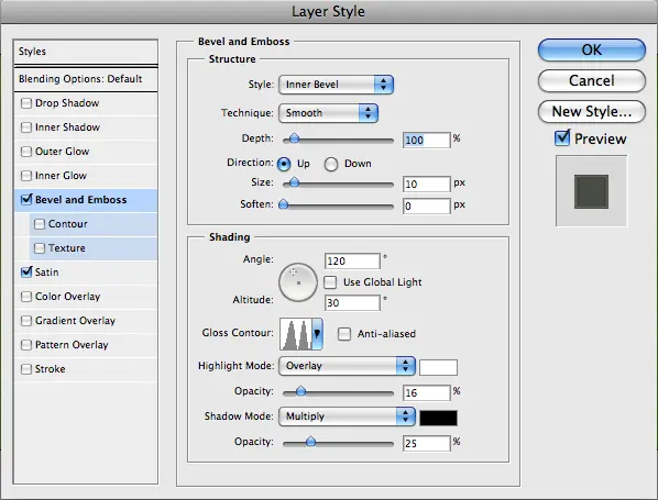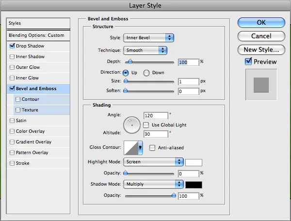 En primer lugar, sin embargo, vamos a añadir algunos estilos de capa para darle un poco más de un aspecto tridimensional. Los estilos se muestran a continuación.