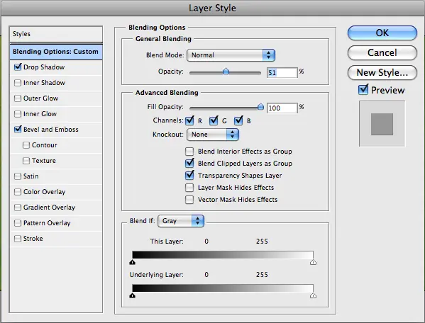 Este es el segundo conjunto de estilos de capa ... (Tenga en cuenta que es 51% de opacidad por lo que voy a mezclarse con la capa anterior)