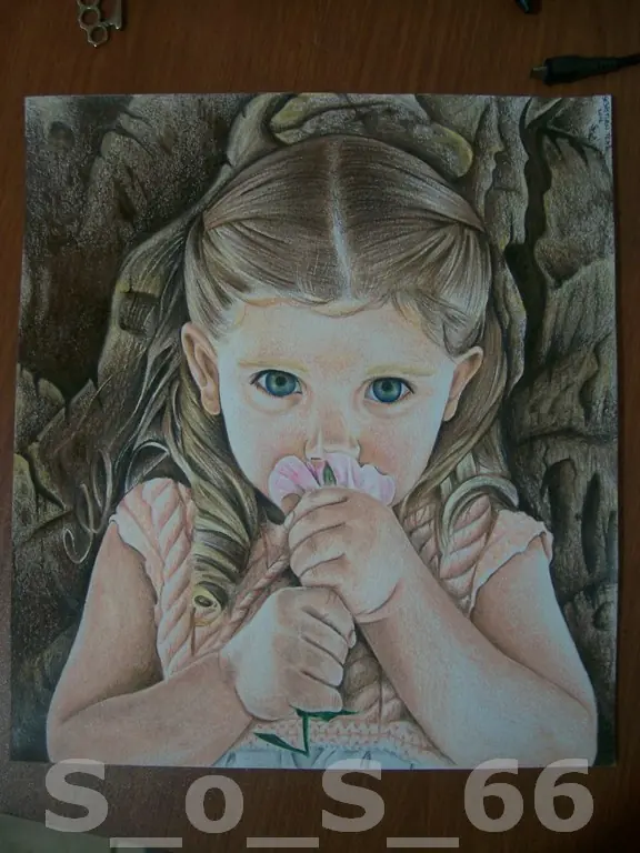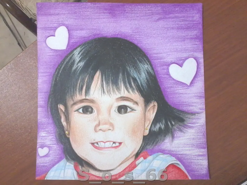 Bueno el trabajo esta hecho con lapices de Colores, sobre una hoja de dibujo, y para el fondo negro use tiza pastel negra y un poco blanco para unas luces.