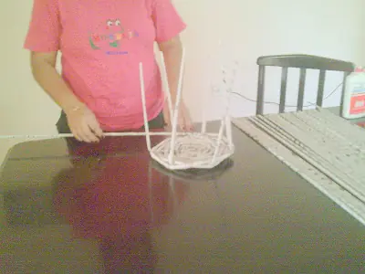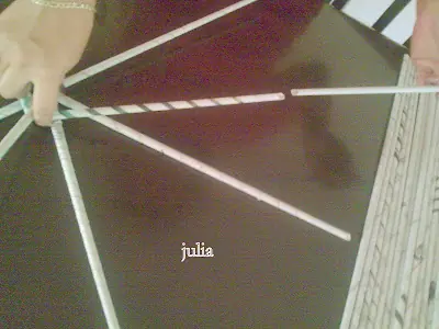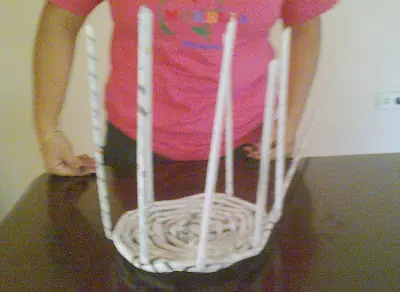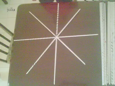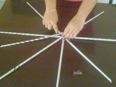 7.-tu calculas el tamaño de la base,esta es como de 18 cm,doblamos los palitos hacia adentro,los palitos quedan parados