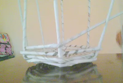 12.-toma 3 palitos y haz una trenza.deja en cada extremo de la trenza 10 cm. para que lo tejas entre los palitos de la canasta y sea la asa.