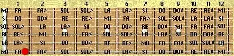 Por ejemplo si queremos obtener el sonido Fa en la 6ª cuerda, el lugar correcto donde se debe pisar es el marcado con un cículo rojo, cómo se puede ver el círculo está lo más cerca posible a la varilla, con lo que la presión es muy suave y el sonido más limpio que si se hiciera más al centro del traste.