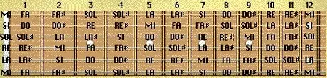 Esta sería una representación gráfica con sostenidos del Diapasón desde el traste 1º hasta el 12, se podría realizar uno igual sustituyendo los sostenidos por su bemol correspondiente (por ejemplo en lugar de Fa# sería Solb). Podéis observar que al llegar al traste 12 se repiten los sonidos pero a una octava más alta.