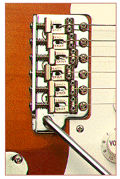 .-Este es el puente característico de las guitarras eléctricas. Su sistema de fijación es distinto al de las guitarras clásicas. Se puede ver también donde se inserta la Palanca del Trémolo.