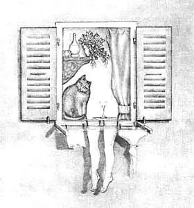 Este dibujo es realmente curioso; a primera vista aparece una joven desnuda de espaldas y con el brazo izquierdo extendido, pero si te fijas también puedes ver el interior de una habitación, en donde hay un gato mirando, una estantería con una botella y una planta encima (arriba a la izquierda), una cortina al lado derecho, una copa en el centro la cornisa de la ventana y ropa tendida en la parte exterior. ¿Eres capaz de ver las dos posibilidades de la imagen?