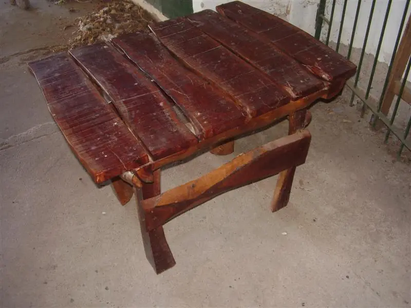Ahora vamos a clavar los travesaños, yo utilicé 2 tablas y 2 troncos finos porque es lo que tenia, pueden utilizar 4 tablas o 4 troncos finos, pero es muy importante que tenga los travesaños porque sino las patas se pueden abrir o la mesa puede quedar inestable.
