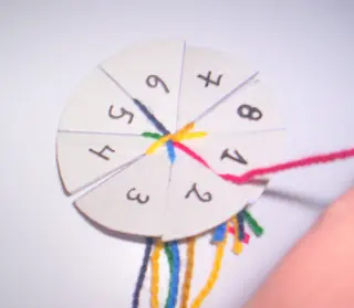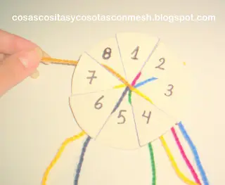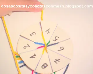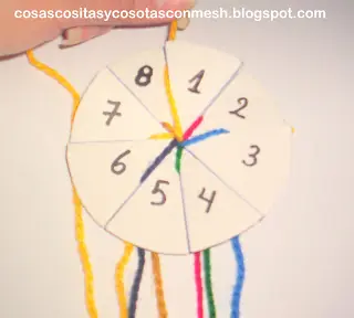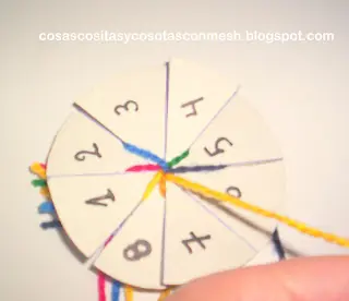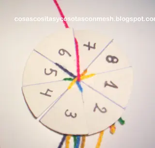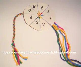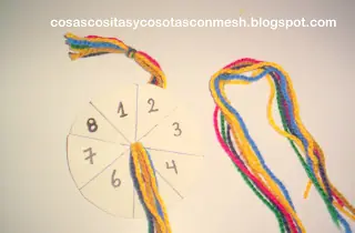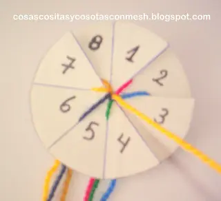 Teniendo ya mi circulo are 8 pestañas cortar estas pestañas sin llegar en el centro ,ya que en el centro are un hoyito ,este hoyito me servirá para pasar mis 7 hilos de diferentes colores recuerda hacer un nudo al inicio .