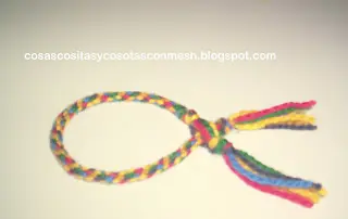 Para amarrar tu pulsera a la mano ,aras lo sigt, en el final de tu tejido (pulsera ),aras 2 nudos dejando medio centímetro entre cada nudo ya que por ahí meteremos el otro extremo de nuestra pulsera como se ve en la foto