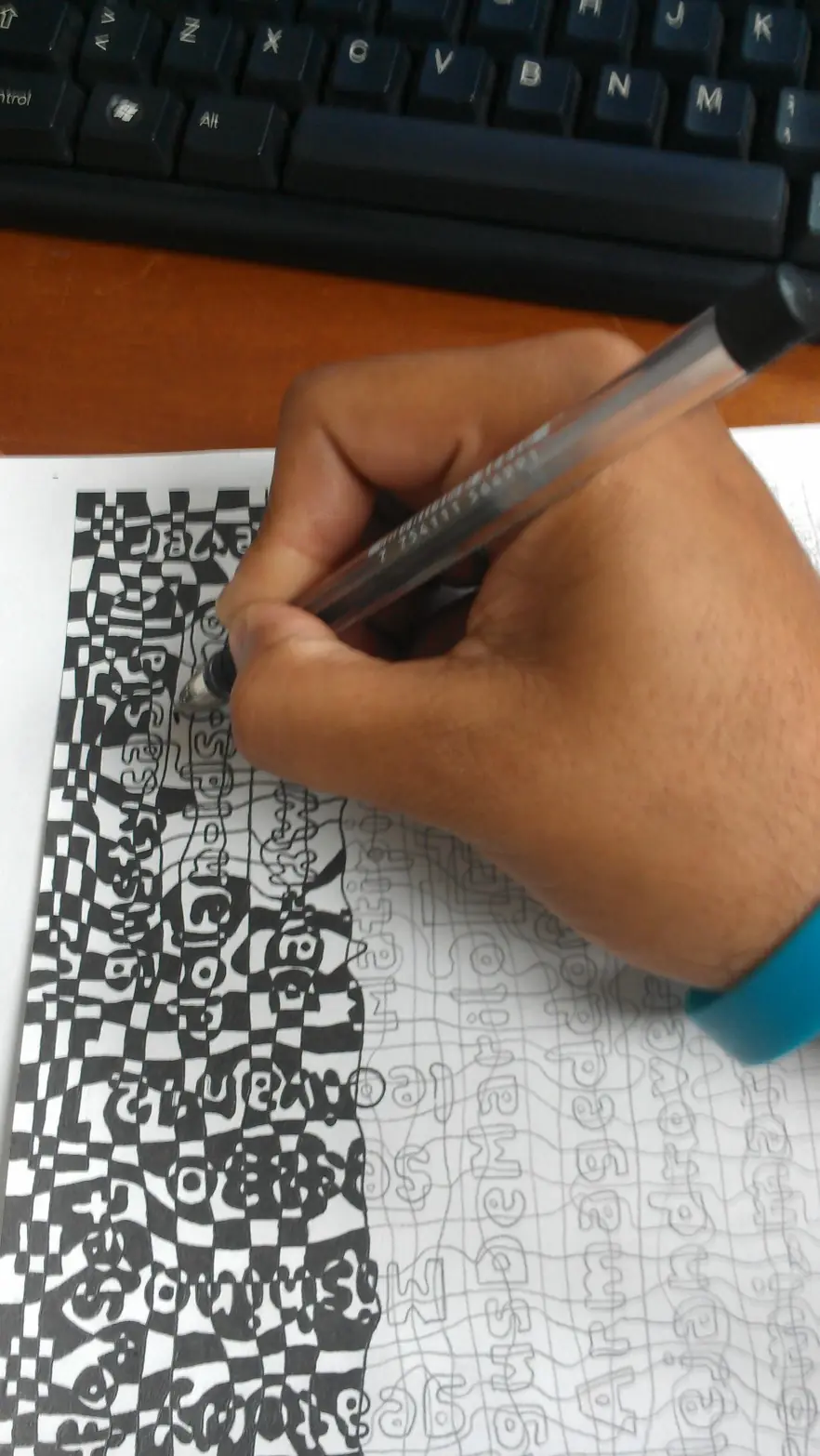 A continuación, viene la parte difícil. Con una pluma color negro comencé a llenar uno por uno los cuadros a los que les corresponde el color negro. Se debe procurar que el diseño sea: blanco, negro, blanco, negro. De manera vertical y horizontal.
