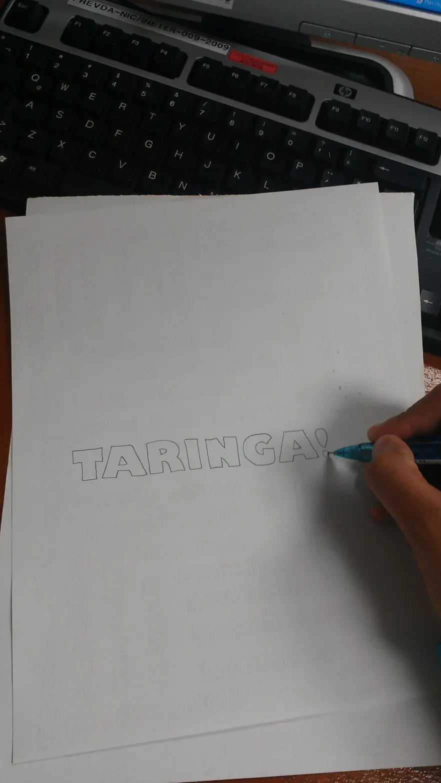 Teniendo listo el diseño, procedemos el llenado de la página. En mi caso primero trate de copiar el diseño con un lápiz de grafito 5H el cual sirve para trazar líneas muy finas y poco visibles, y luego con un lápiz de minas (HB) repintas las letras una por una. Es mejor hacer el diseño de manera manual, para que el efecto sea más dinámico.