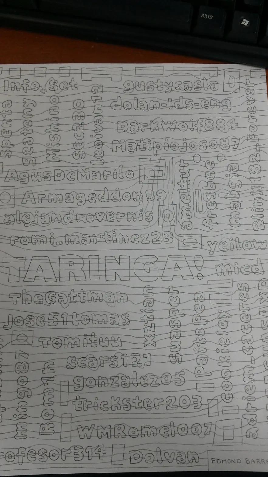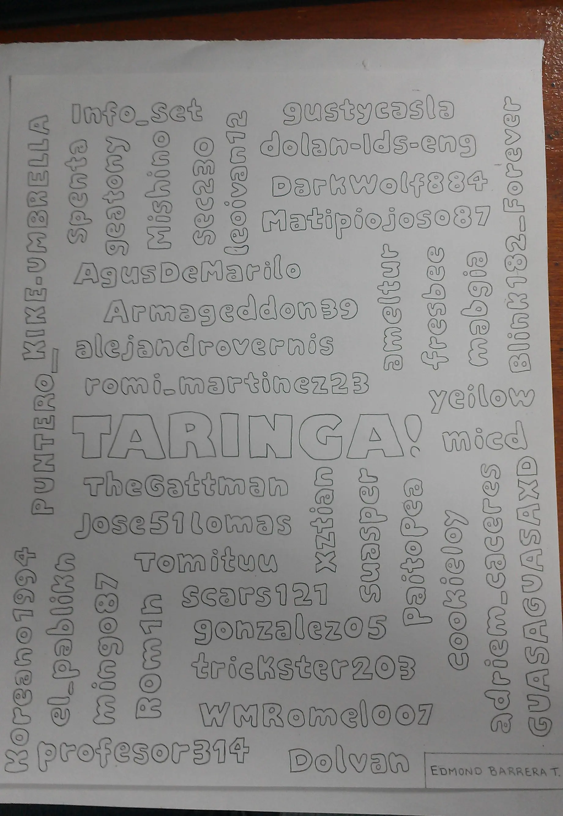 Lo primero que debes de hacer es escoger un estilo y tener en mente que mensaje quieres poner dentro del dibujo. En mi caso mi idea fue colocar en el centro el nombre de TARINGA y llenar el resto de la pagina con los Nick de algunos Usuarios de la Comunidad.