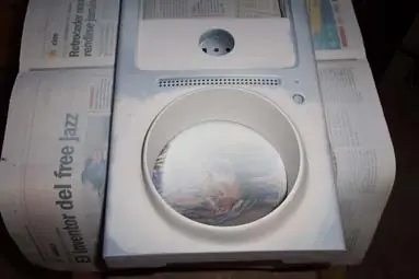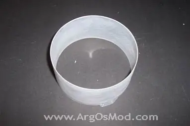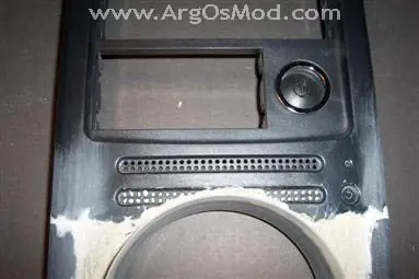 Cortamos el frente y para hacer la tobera utilizaremos el recipiente de los DVDs vírgenes, lo mediremos y cortaremos el sobrante, debemos lijarlo bien con una lija mediana para que se adhiera la masilla y la pintura.