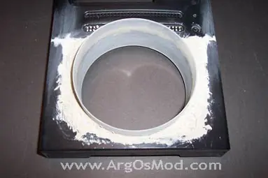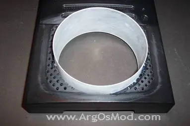 Realizaremos la tobera con otro recipiente de DVDs y con una plancha plástica, la que le daremos la forma para pegar la tobera y pueda ser atornillada al gabinete. En la ultima imagen pueden ver como quedaría finalmente.