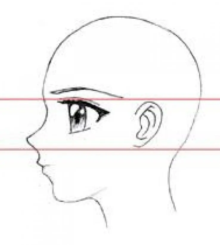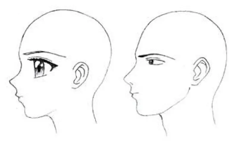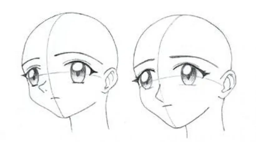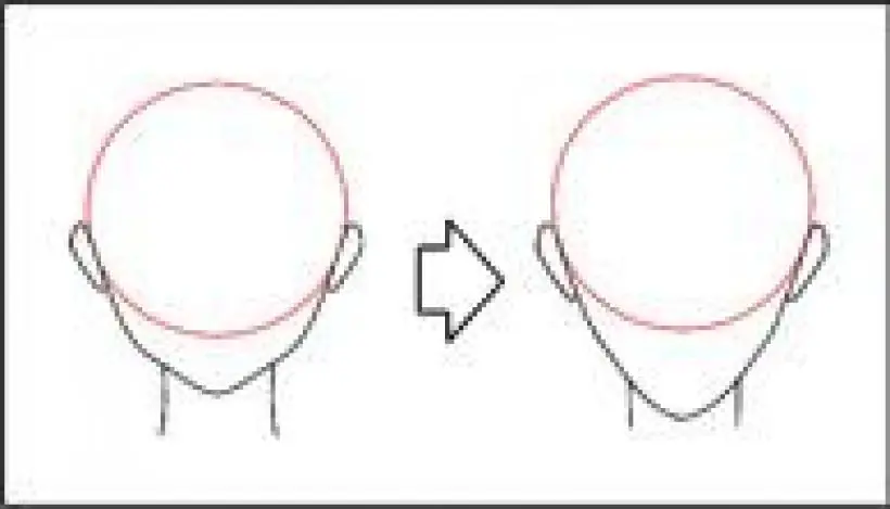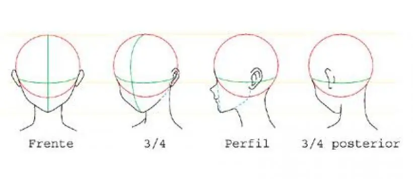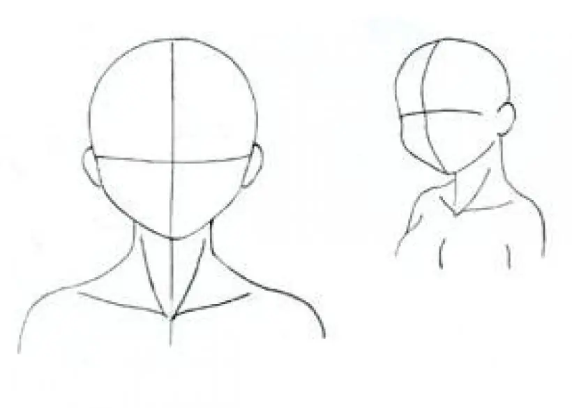 Se toma como base una esfera y luego se le añade la quijada. La línea de la quijada llega hasta detrás de las orejas, pero a veces no se dibuja por completo para que el rostro no se vea muy tosco, en especial si se trata de una mujer. Según la edad del personaje, la forma de la cabeza puede variar. Mientras más adulto es el personaje, la cabeza se hace más alargada.