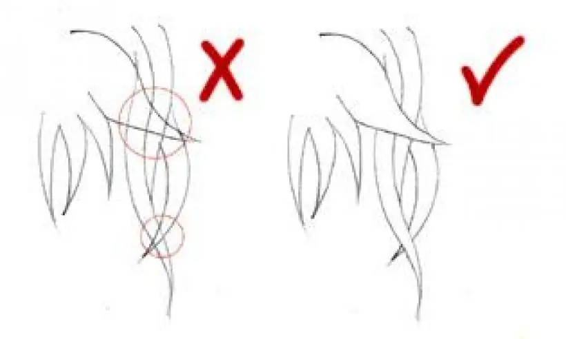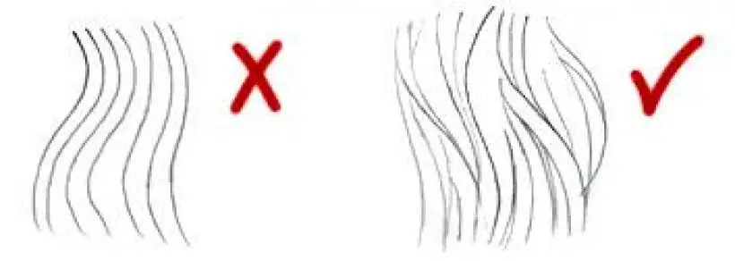 Los “mechones” de cabello no deben ser todos iguales, siempre hay que variar su forma y tamaño para que se vea mejor (no deben parecer plátanos). Para que el cabello se vea más natural, los trazos deben ser sueltos.