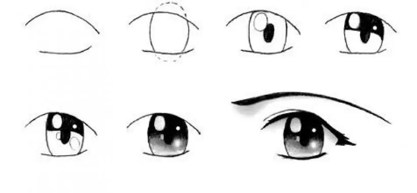 Los ojos pueden ser de muchos tipos según el gusto del dibujante. Primero se dibujan las líneas donde irán las pestañas. Las pestañas de arriba son más gruesas que las de abajo. Luego se dibuja la córnea y al centro la pupila. La córnea puede ser redonda u ovalada. La parte superior va pintada de negro o de un color oscuro.