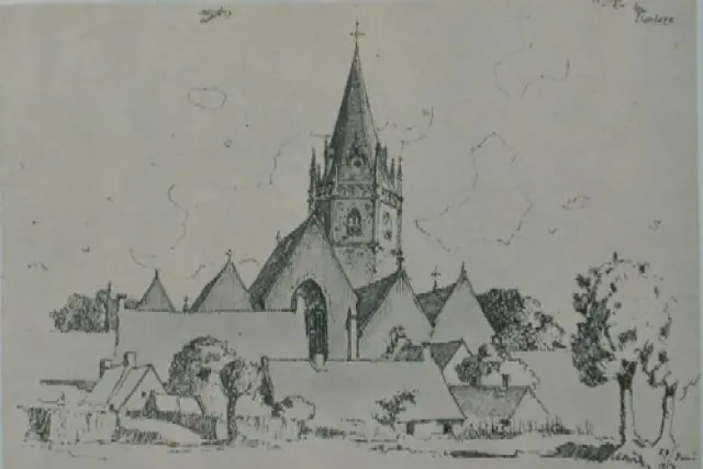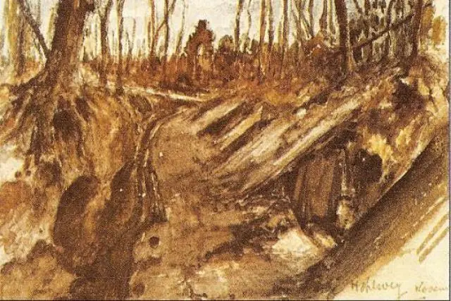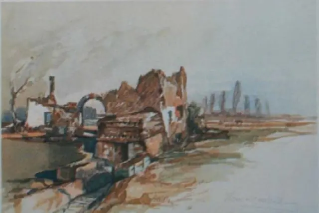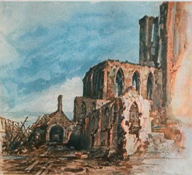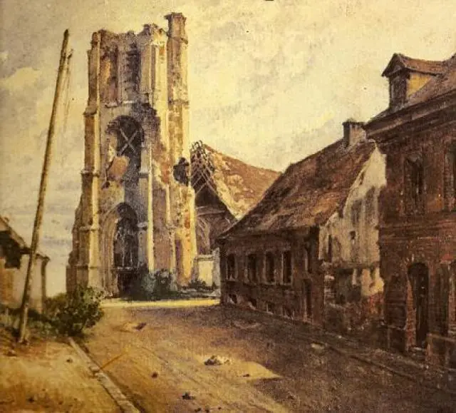 Esta acuarela de Hitler de Becelaere, en el frente belga muestra los efectos de un bombardeo y la iglesia gotica del pueblo.