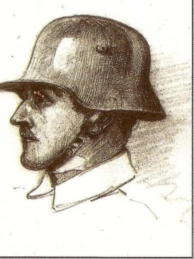Este retrato a lápiz de 1916 de un soldado de infanteria muestra el nuevo casco de acero introducido el mismo año en el ejercito aleman.