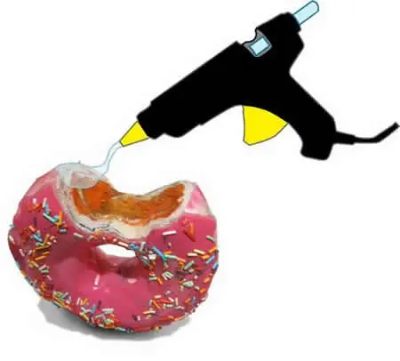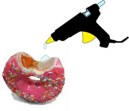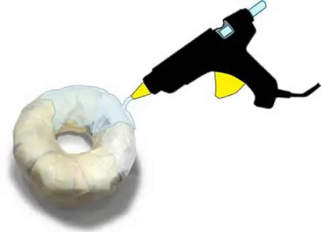 teniendo cuidado de no quemarse colocar una generosa capa de pegamento caliente con la pistola sobre la parte superior de la rosquilla