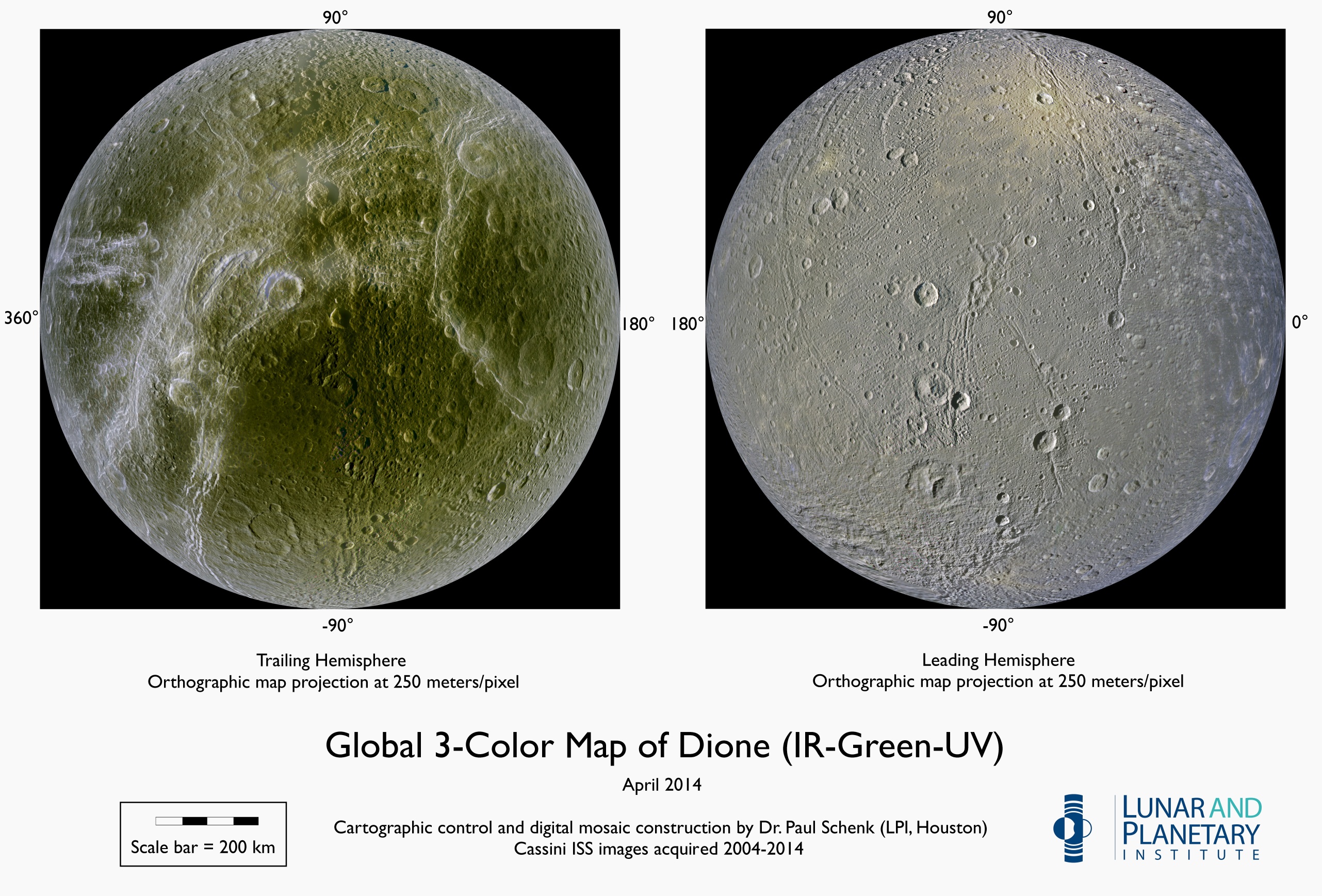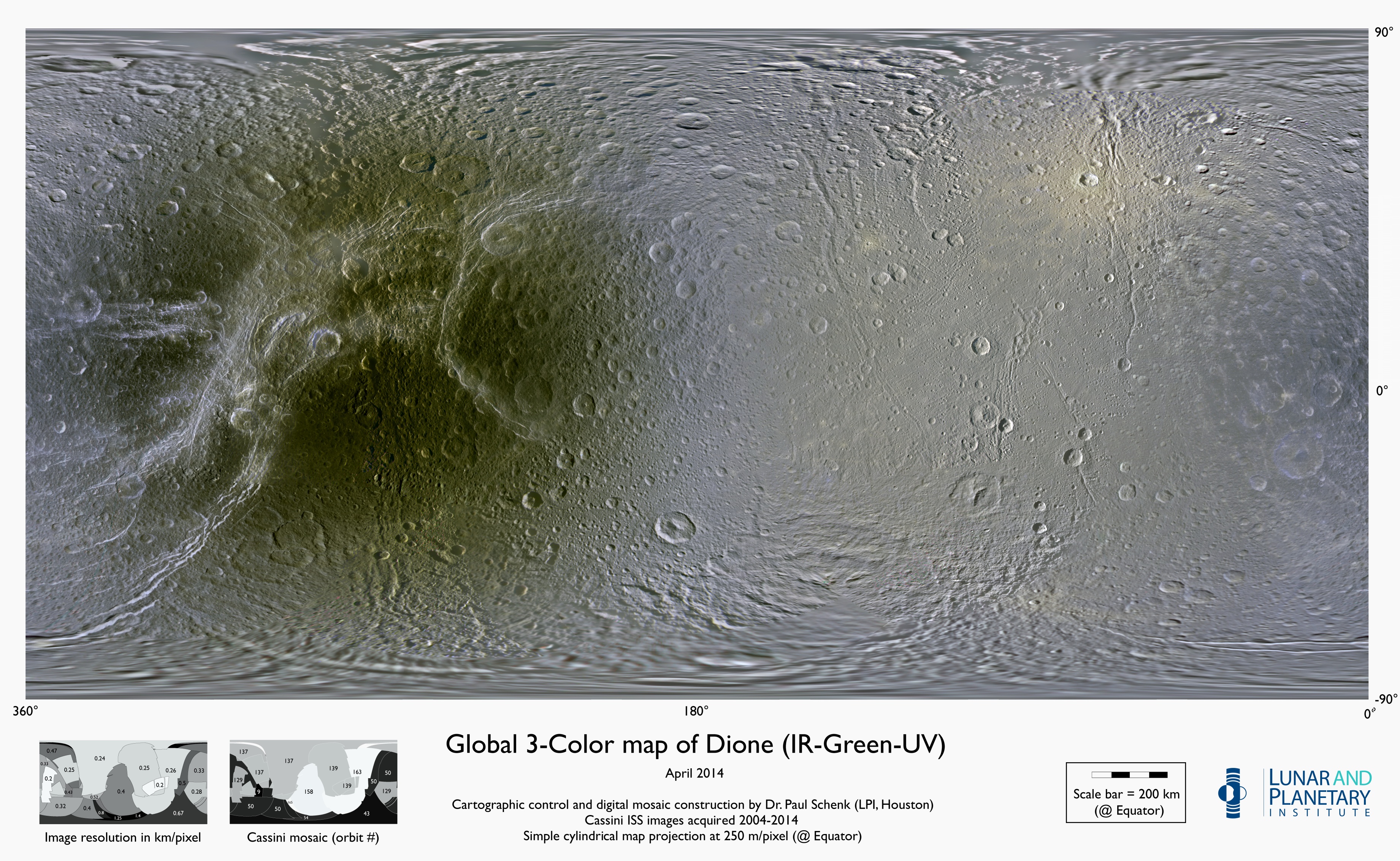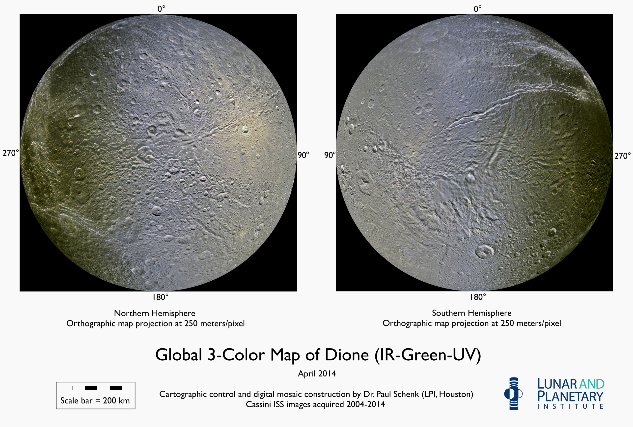 Aunque la rayas, en realidad quebraduras, en la superficie de Dione parezcan tenues y borrosas, son en realidad una serie de frescas fracturas geologicas.
