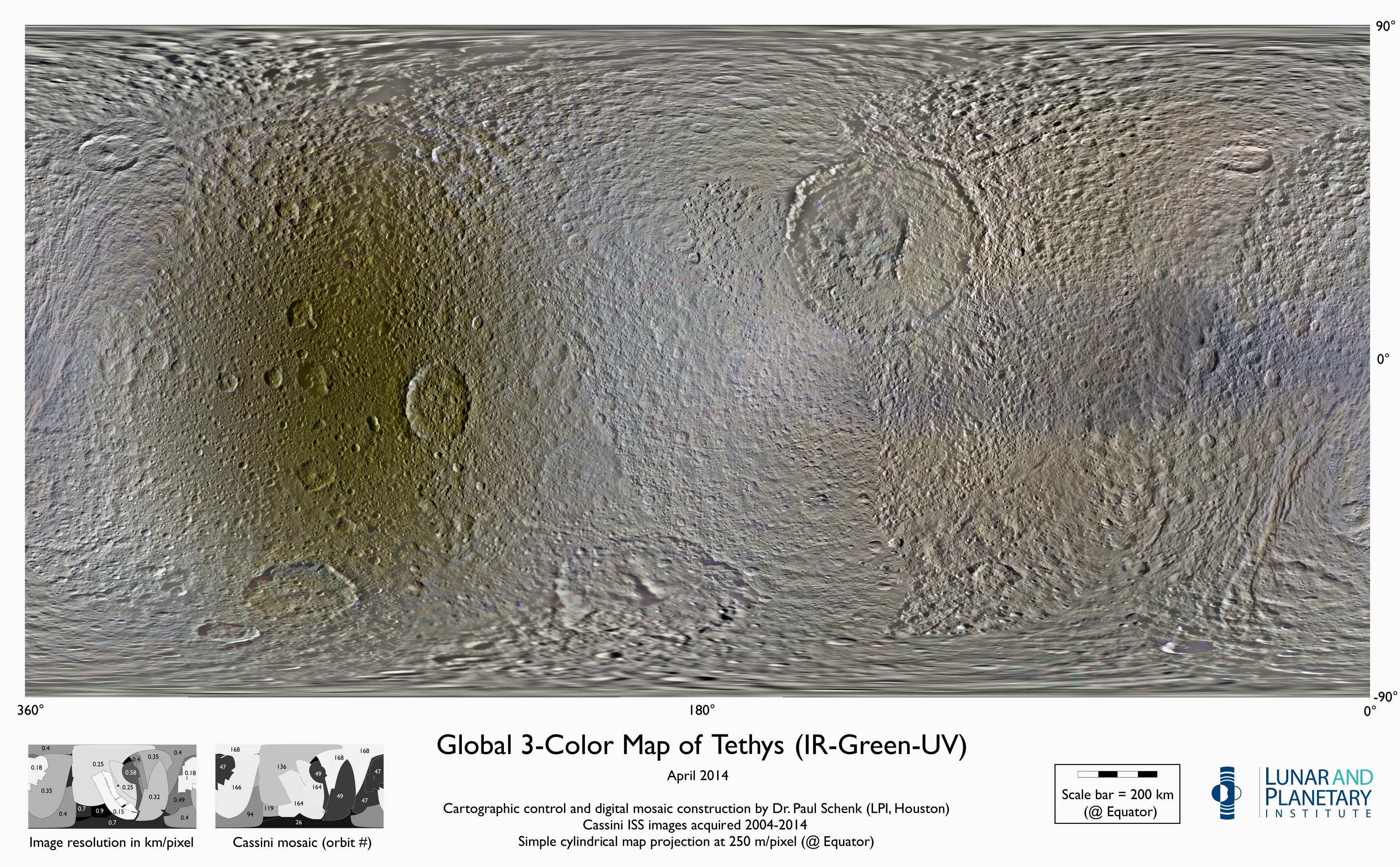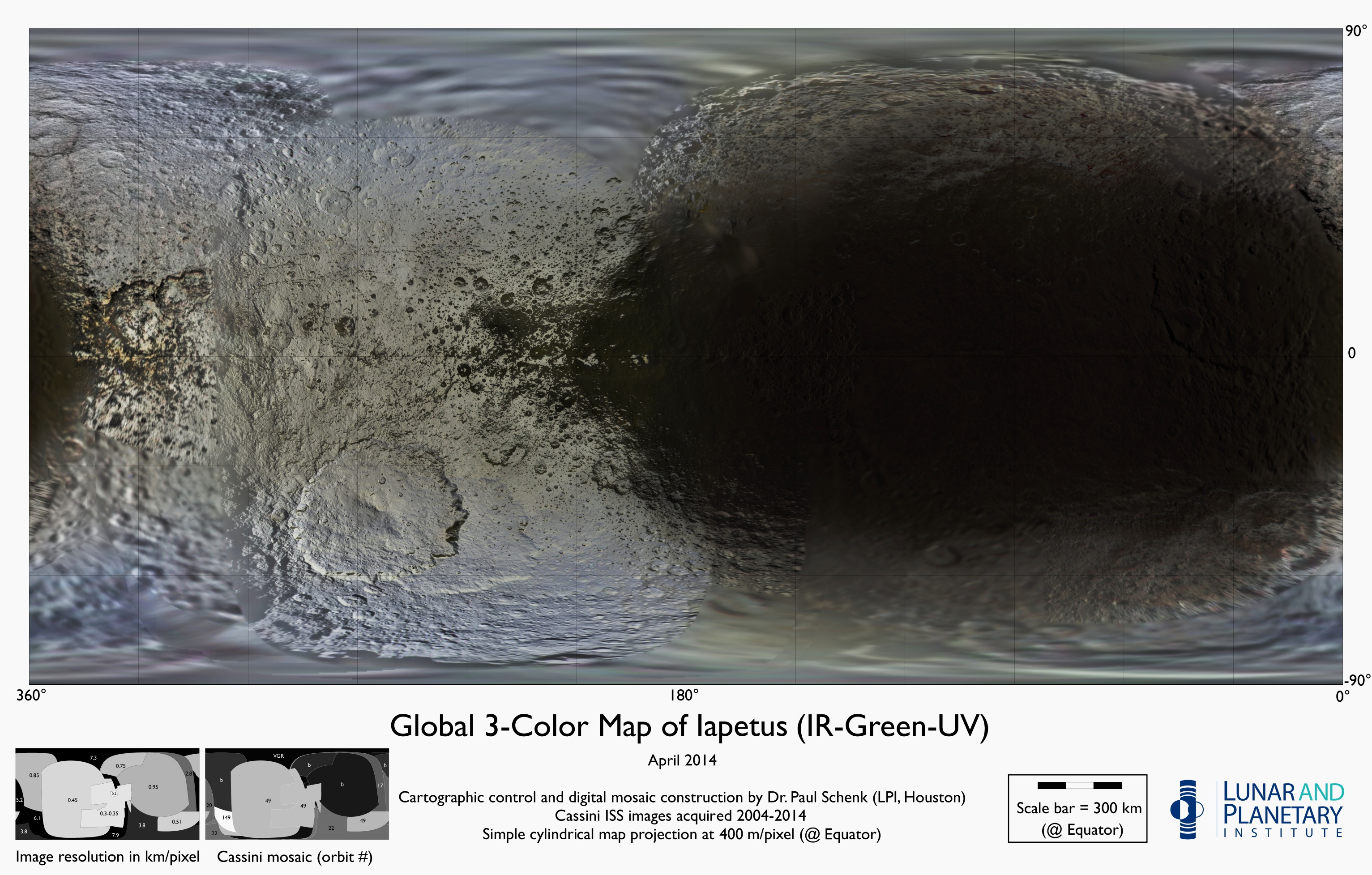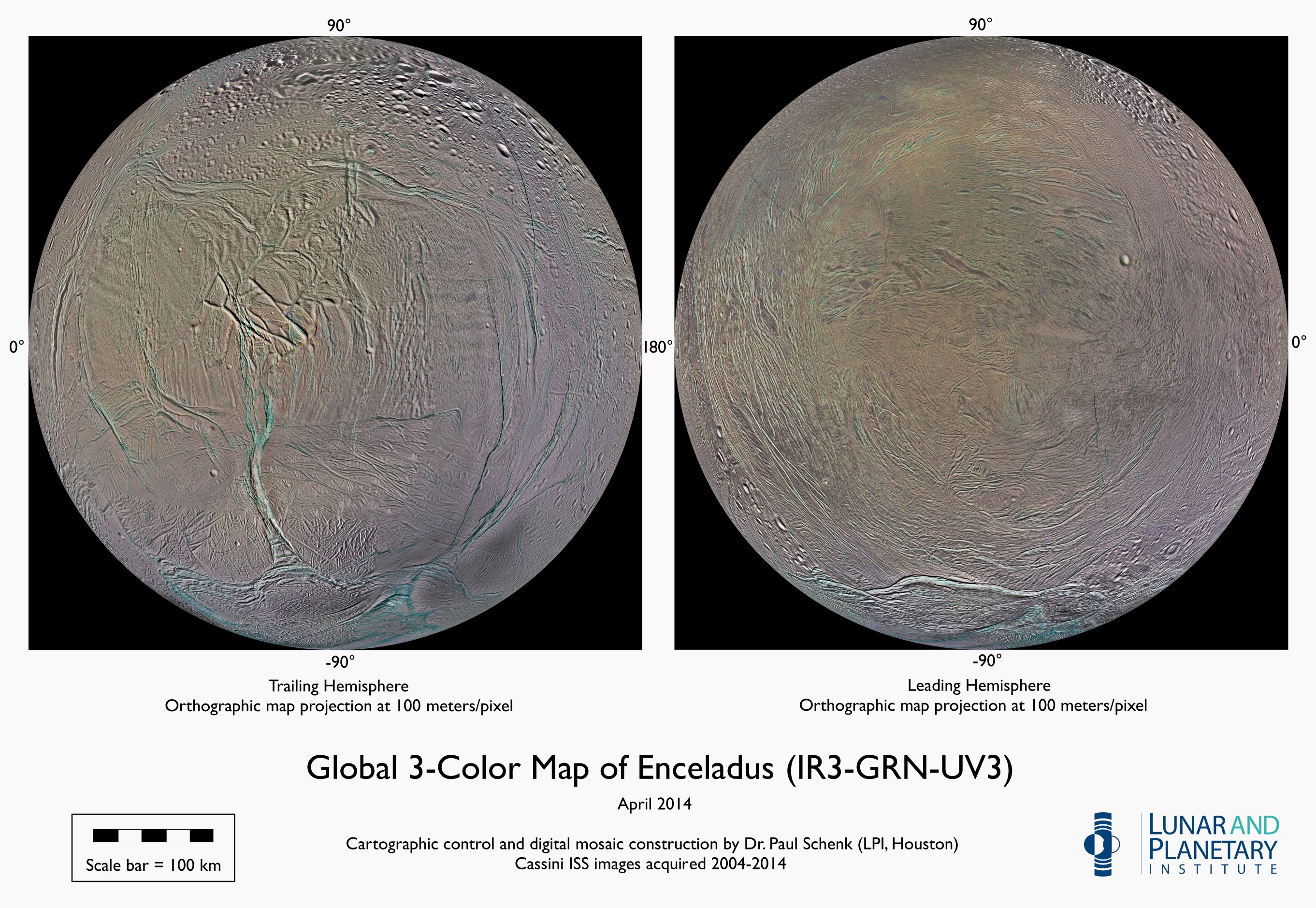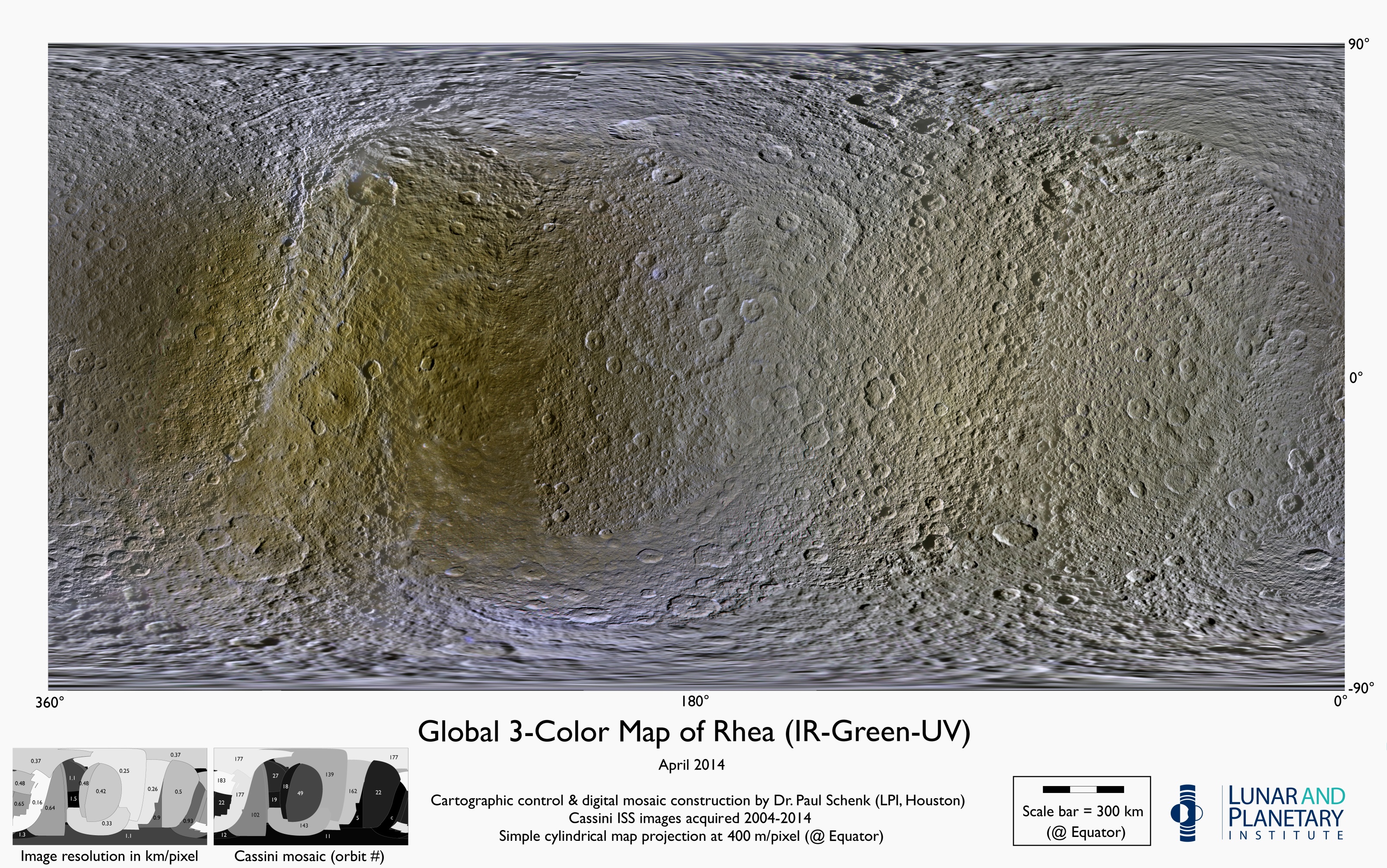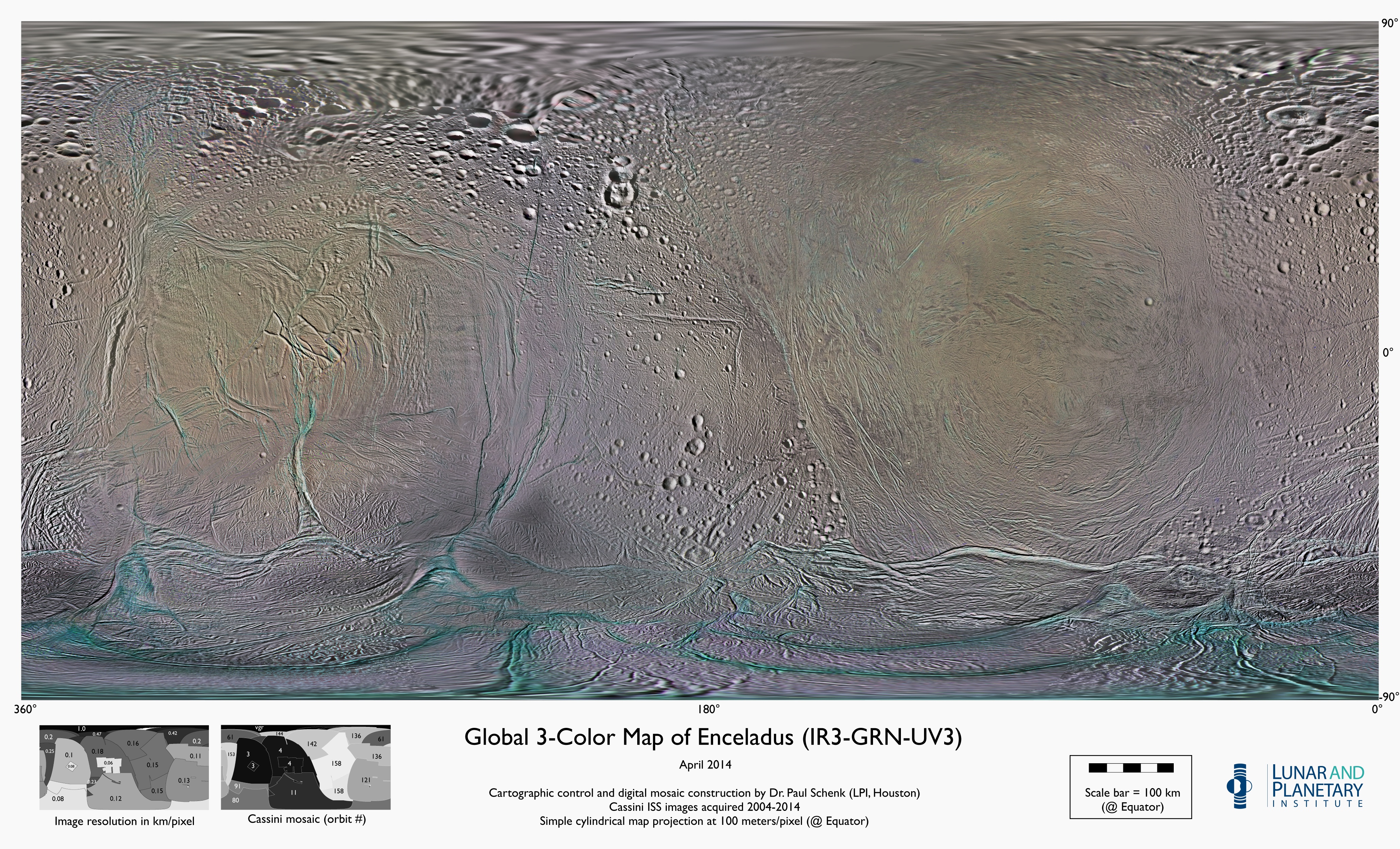Los colores mostrados son realzados y en un espectro mas amplio que la vision humana ya que incluyen imagenes en espectro verde, ultravioleta e infrarojo. Algunas zonas se muestran un poco borrosas por que Cassini las tomo en angulo