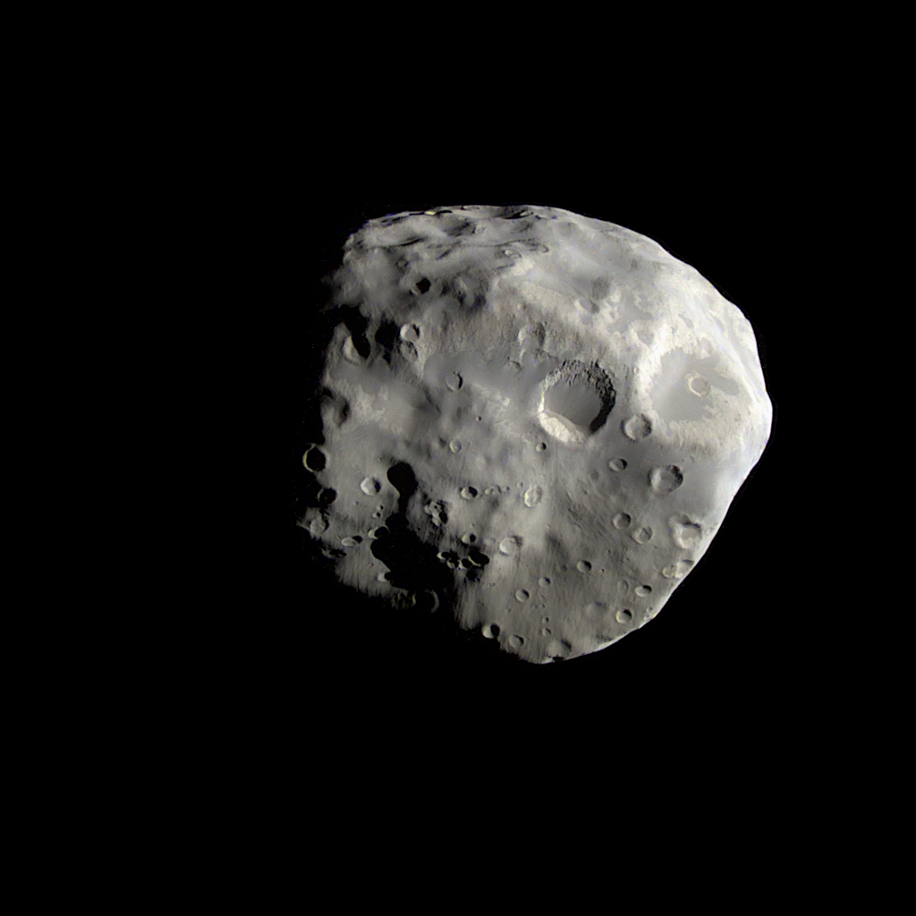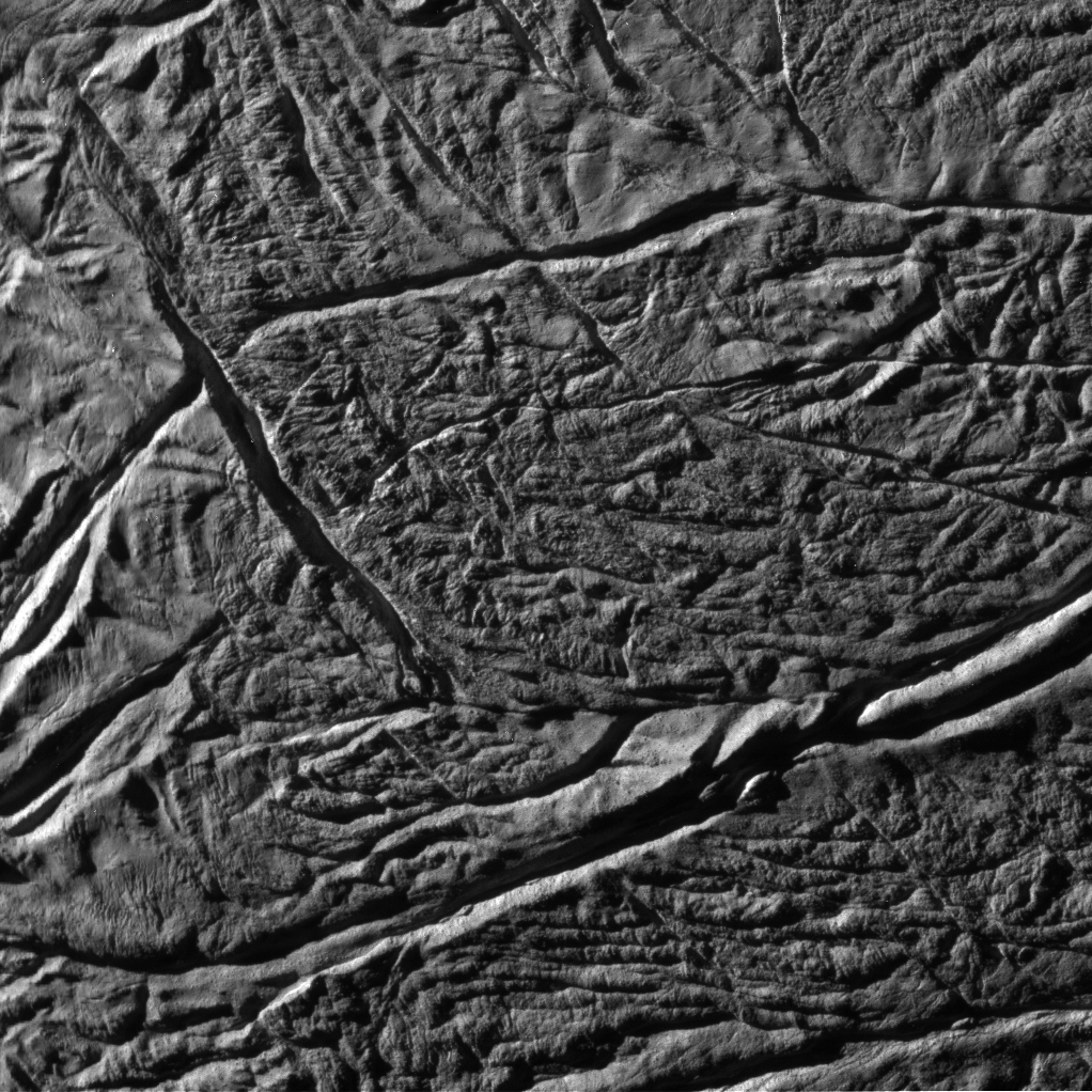 Esta imagen muestra lo que parece ser los restos de un gran impacto cubriendo la mayor parte de esta cara, tambien se cree que es la causa de la apariencia plana del sur de la luna de 113 km de ancho. Se cree que esta mayormente compuesta por hielo de agua