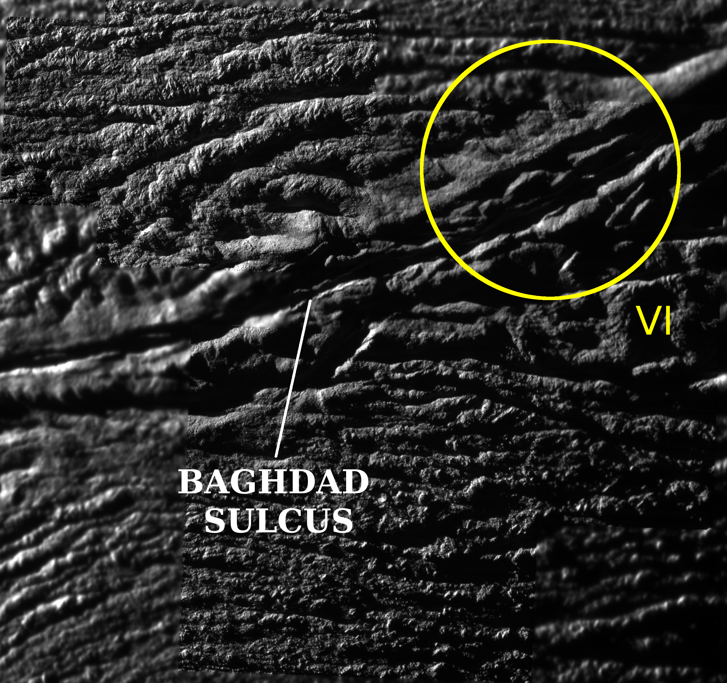 Los atractivos o caracteristicas mas relevantes en Encelado fueron bautizados con nombres de personajes y lugares de Las mil y una noches (The Arabian Nights), y los cuatro sulcus (surcos en ingles) mas destacables son nombrados como Alexandria, Cairo, Baghdad y Damascus. En la imagen de abajo vemos a Baghdad Sulcus y a Cairo Sulcus