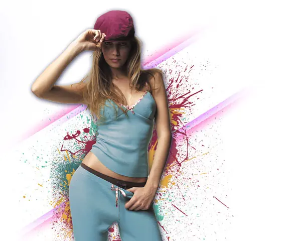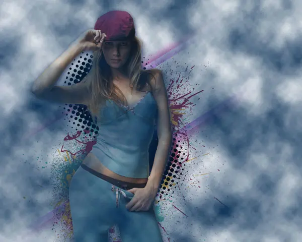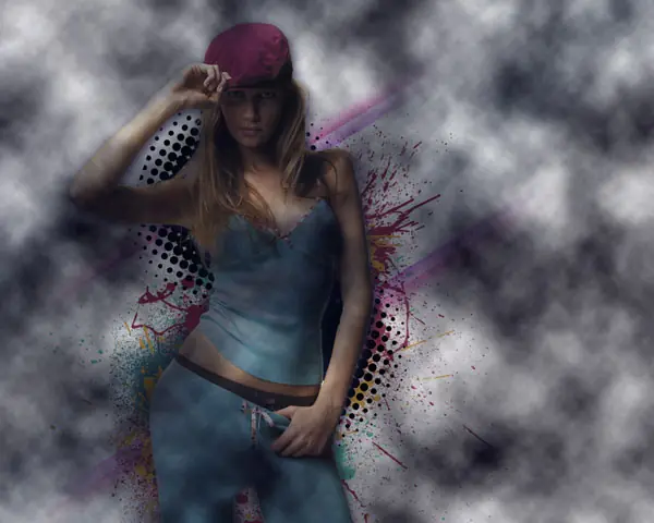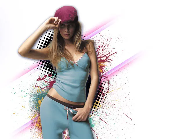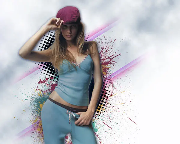 Agregue un poco de pinceladas con los colores siguientes: # DFA63D , 5CC1AA # , # 952941 , # A34057 , # 3C7075 . Coloque las capas con los pinceles en la capa de la chica.