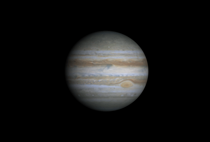 Asi es como se veria Jupiter si estuviera perpetuamente iluminado y uno pudiera centrarse en la Mancha Roja por 10 dias. Se logro esta simulacion al extender el mapa 2D publicado anteriormente sobre un esferoide oblato simulando el tamaño y forma de Jupiter