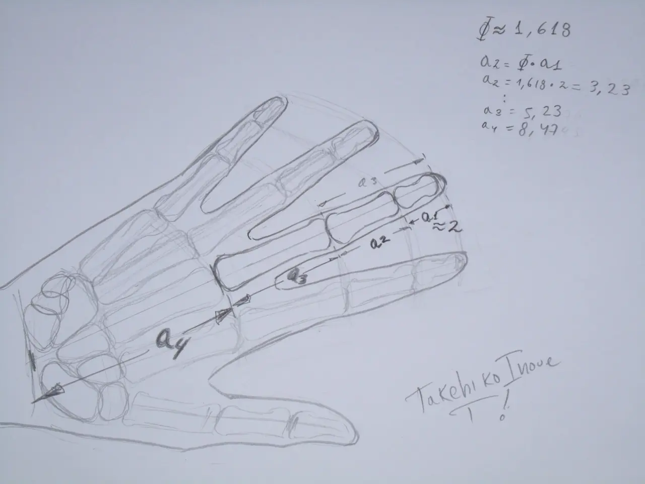La relación entre el primer hueso de los dedos (metacarpiano) y la primera falange, o entre la primera y la segunda, o entre la segunda y la tercera, si dividimos todo es phi.