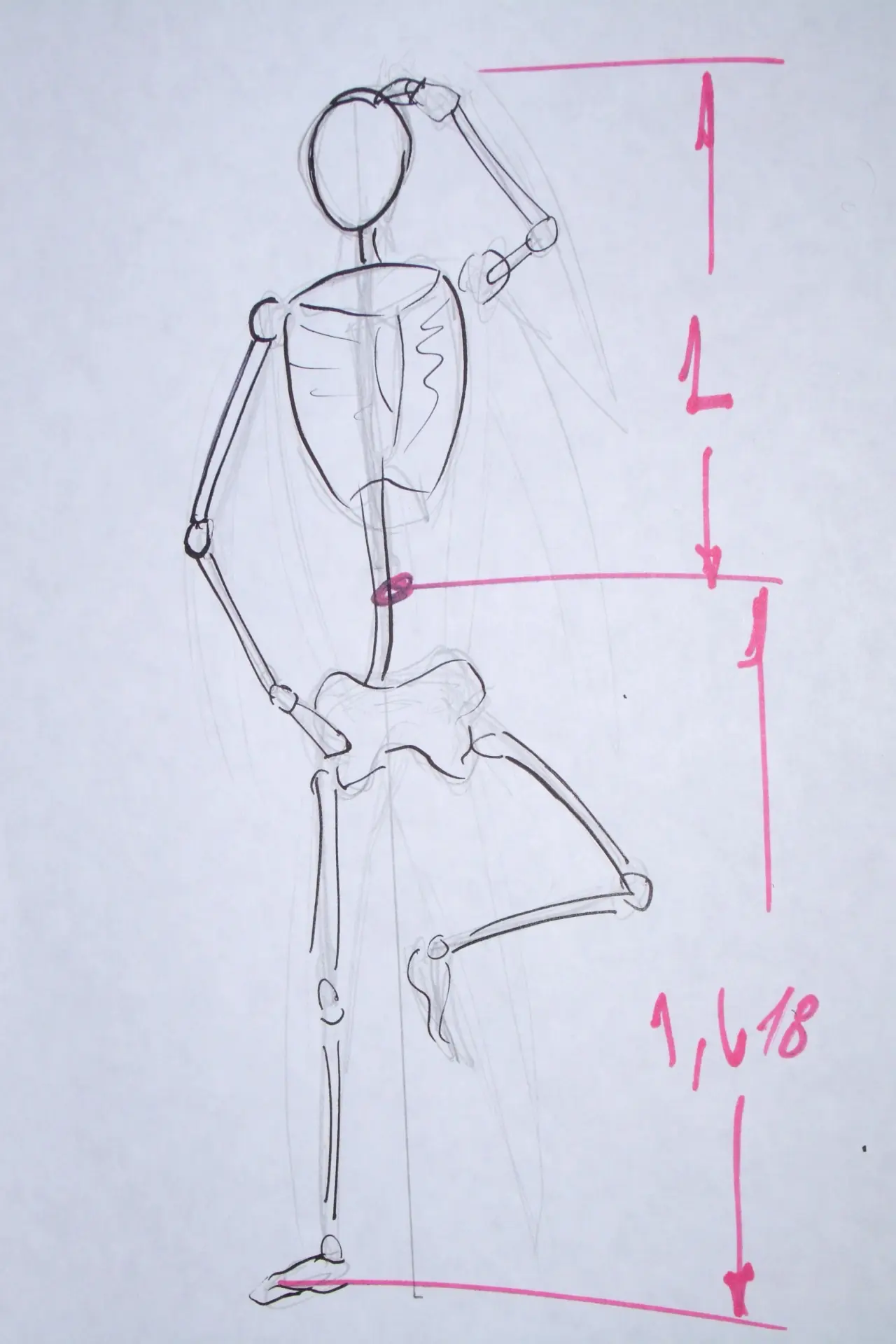 Estirando manos y pies y haciendo centro en el ombligo, se dibuja la circunferencia. El cuadrado tiene por lado la altura del cuerpo que coincide en un cuerpo armonioso, con la longitud entre los extremos de los dedos de ambas manos cuando los brazos están extendidos y formando un ángulo de 90º con el tronco. Resulta que el cociente entre la altura del hombre (lado del cuadrado) y la distancia del ombligo a la punta de la mano (radio de la circunferencia) es el número áureo.