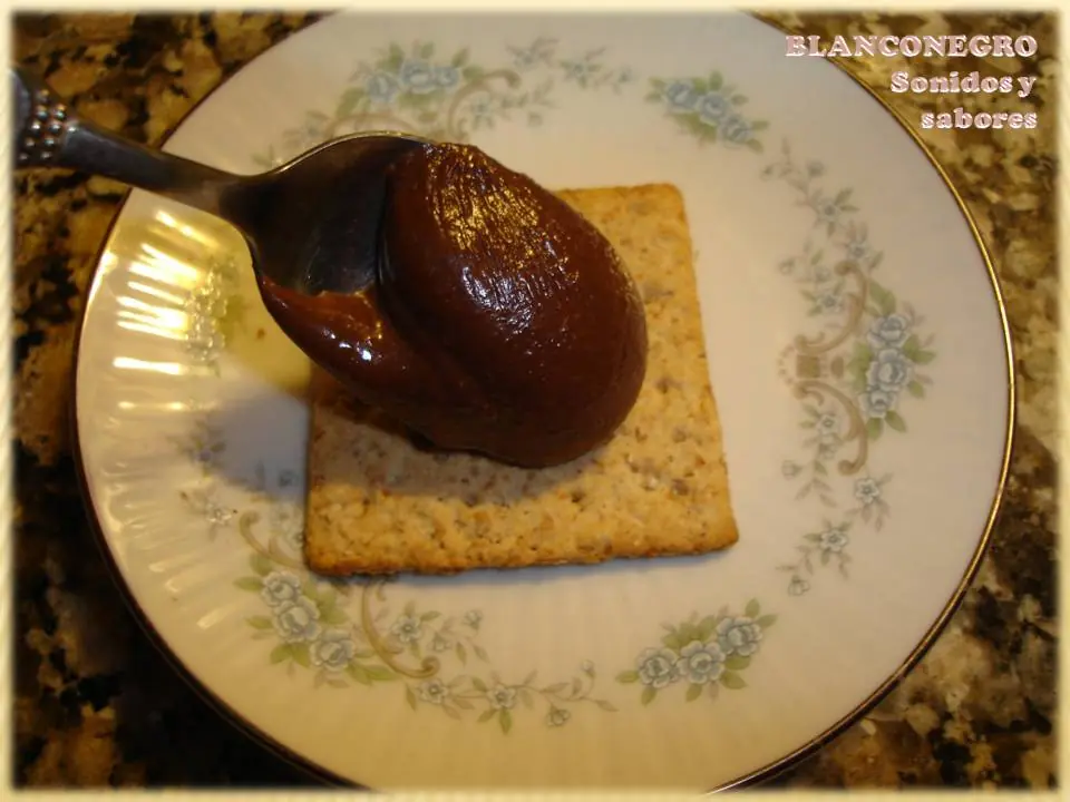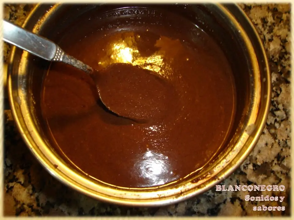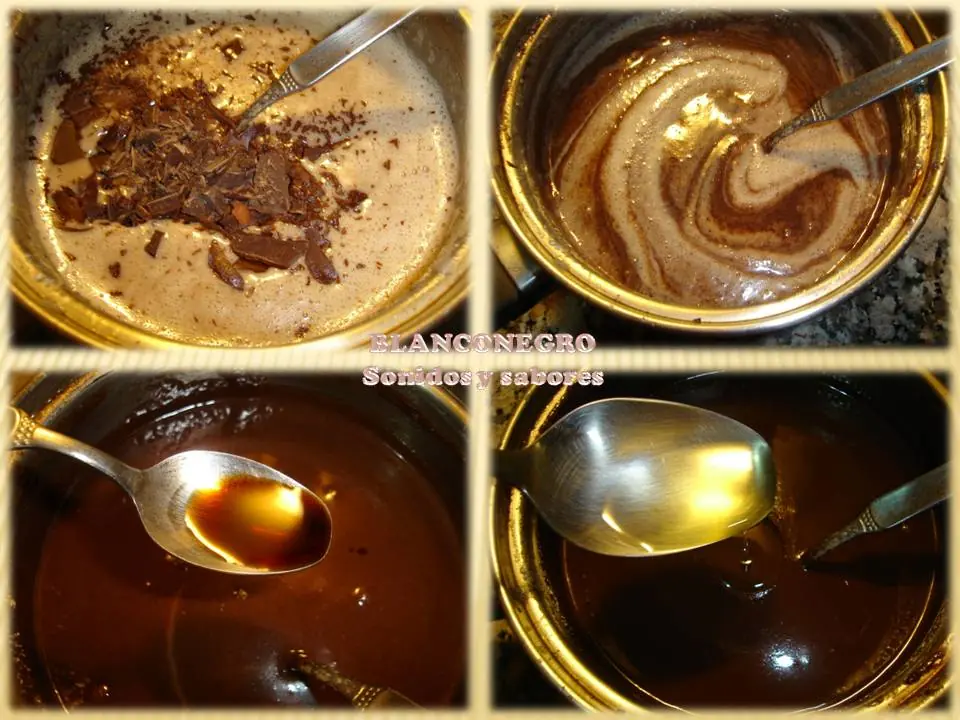 Agregar 100 g. de chocolate para taza (o cobertura semiamargo) picado y dejar fundir con el calor remanente de la preparación. Es importante que el chocolate sea de buena calidad y no contenga grasas trans. Una vez fundido el chocolate y mezclado, añadir ½ cdita. de esencia de avellanas o de vainilla y 3 cdas. de aceite neutro (de maíz, canola, etc.).