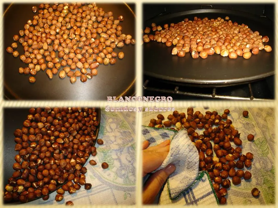 Colocar 100 g. de avellanas sin cáscara en una placa y tostar en el horno a temperatura moderada durante 10’. Pasar a un repasador y frotar para que se desprenda algo de la piel fina y rojiza que las recubre. Este proceso permitirá que las avellanas desprendan todo su sabor al toststarse.