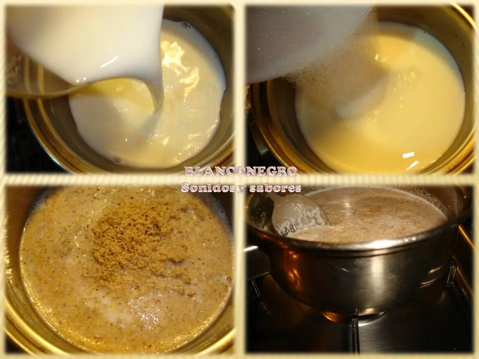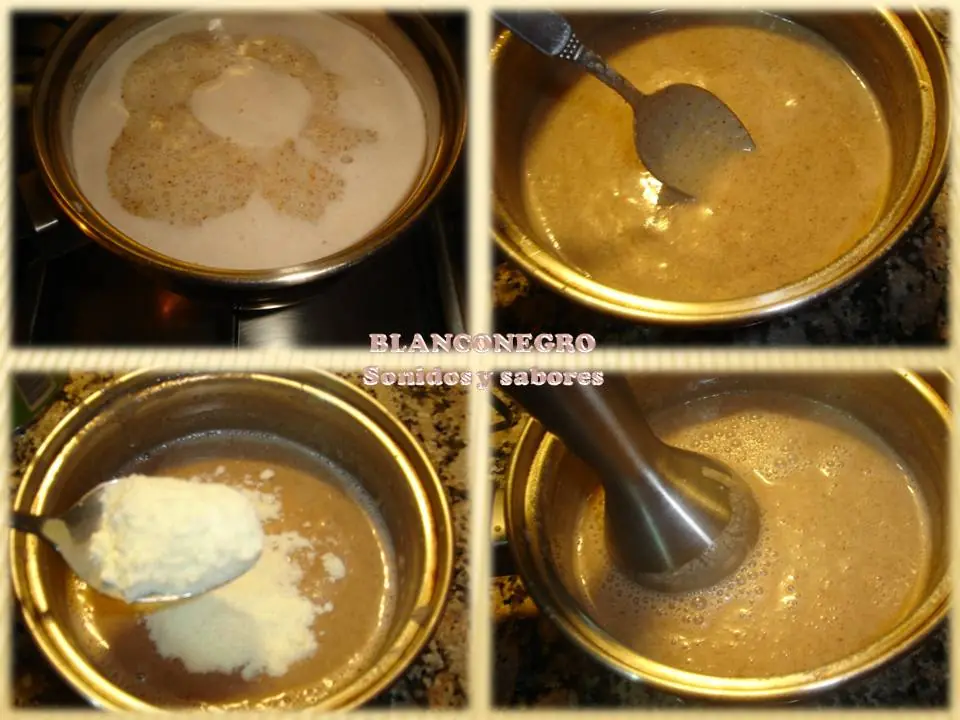 Colocar 220 c.c. de leche descremada en una olla (hasta 300 c.c., según se desee una consistencia normal o más liviana), 100 g. de azúcar y las avellanas tostadas, peladas y molidas. Llevar a hervor.