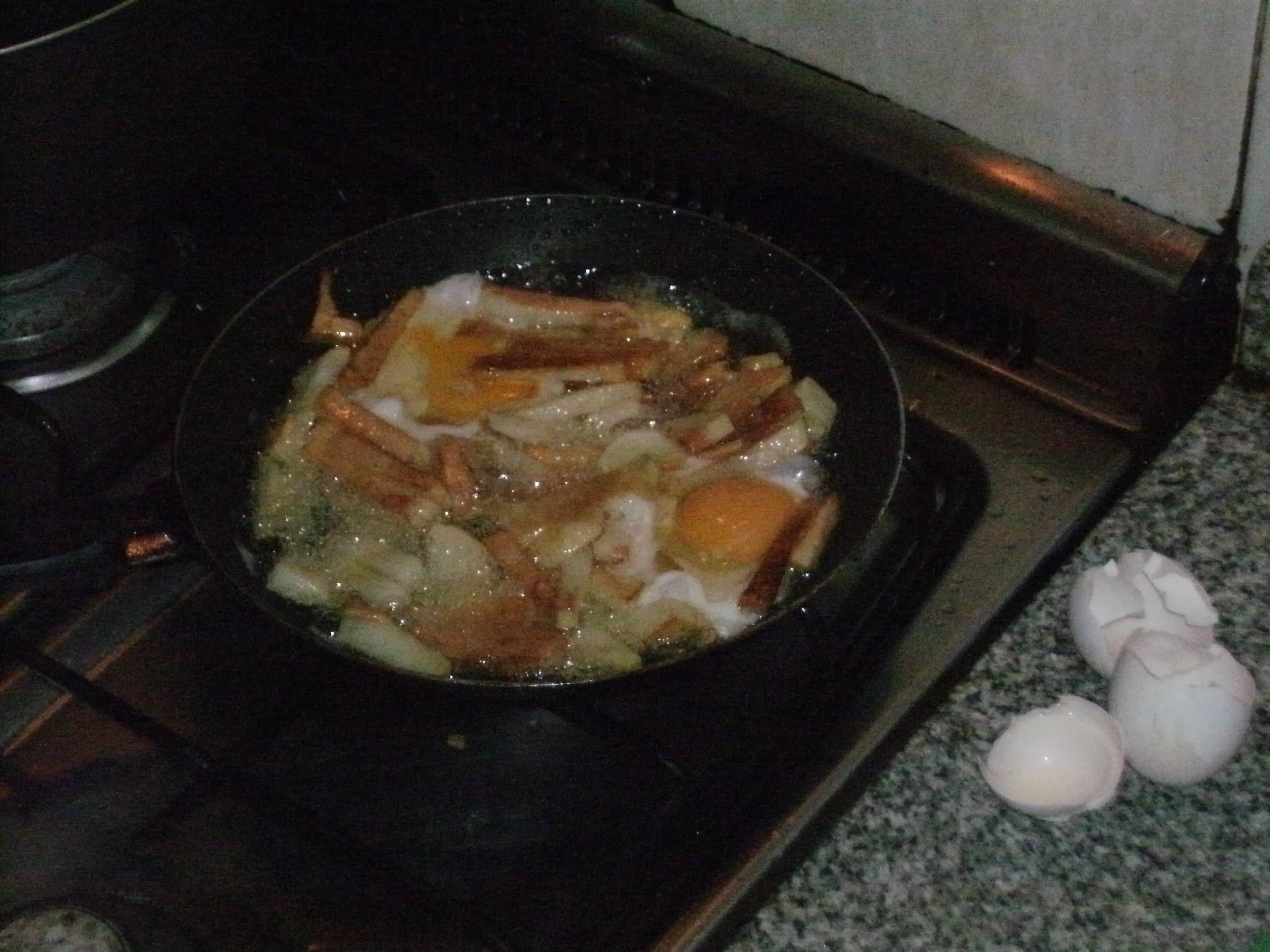 Bueno medio que lo dí vuelta tarde, que no les pase, ni bien ven que se está dorando lo dan vuelta, le dejan un espacio a los huevos y ahí aplican la rompedura de huevos sobre el espacio que les dejan. Algunos no les deja espacio, lo cual está bien tambien.