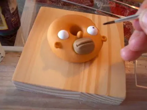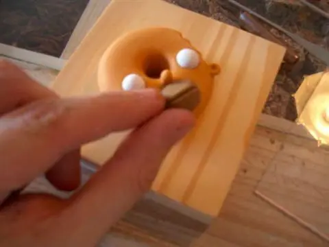 Para las orejas, con los trozos que sobraron al hacer el orificio central, tomar pedacitos y moldear como en la imagen. Luego colocarlas en la cabeza. Igual hacer con la nariz.